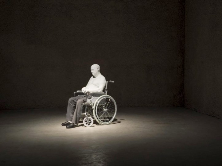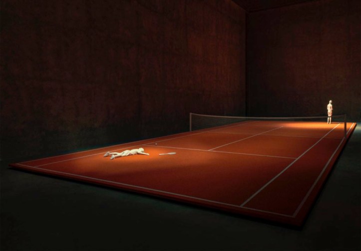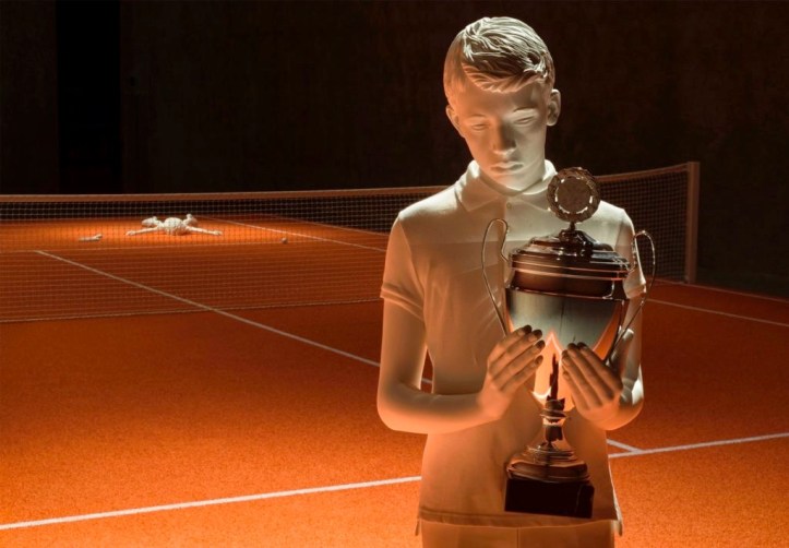 Gli artisti ci presentano solo un campo da tennis con tre figure in marmo bianco: un ragazzino stramazzato a terra, come precipitato dalla vetta del successo, un giovane triste con una coppa in mano e un vecchio in sedia a rotelle.
