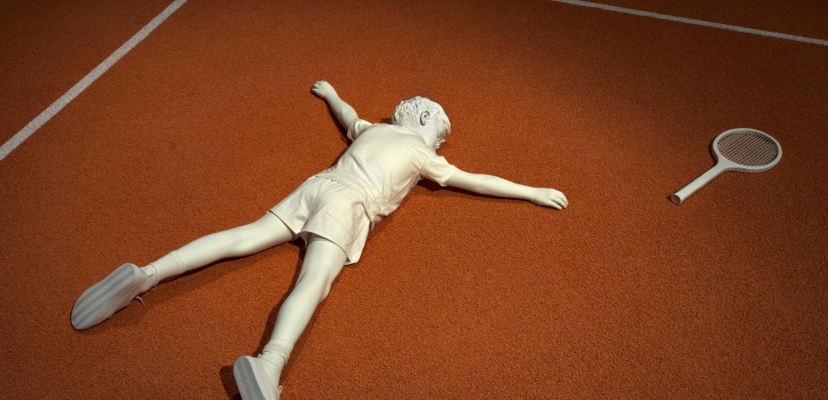 Gli artisti ci presentano solo un campo da tennis con tre figure in marmo bianco: un ragazzino stramazzato a terra, come precipitato dalla vetta del successo, un giovane triste con una coppa in mano e un vecchio in sedia a rotelle.