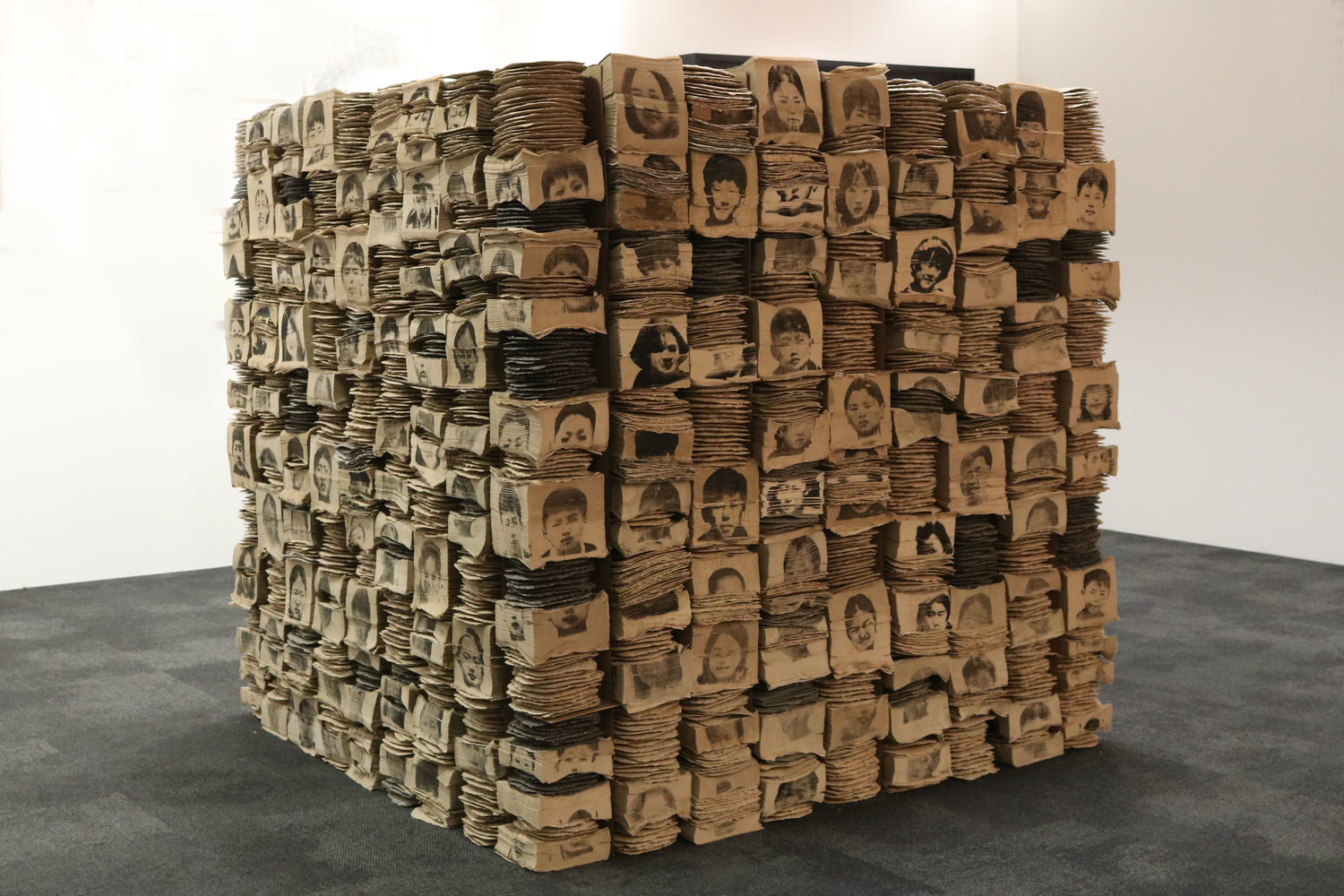 Si tratta di un cubo costruito impilando tovaglioli su cui sono state stampate, in una monocromia molto sebaldiana, i ritratti dei compagni di classe dell’autore, recuperati da una vecchia foto di gruppo.